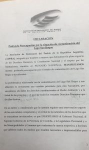 “En el marco del I Plenario Nacional de ADPRA del año 2019 (“Asociación de Defensores del Pueblo de la República Argentina”), planteamos nuestra profunda preocupación por la situación de contaminación del Lago San Roque y propusimos se exhorte a las autoridades competentes a los fines de lograr una solución definitiva a dicho flagelo.