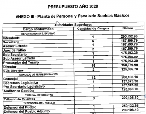Para el año que viene los sueldos de la planta politica quedan determinados de la siguiente manera segun el Presupuesto que bajo el municipio al Concejo de Representantes.