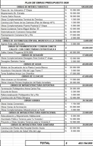 Asi pues nos encontramos con obras como “sistematizacion calle Rosario”, CICLOVIAS, “Paseo de las Canteras”, “ampliacion Rizzuto-puente Rizzuto”, “mejoramiento Bv. Estrada”, en materia de agua: el módulo de decantación de la planta de Cuesta Blanca y la toma subálvea del arroyo Los Chorrillos, entre otras que fueron parte de anteriores presupuestos.