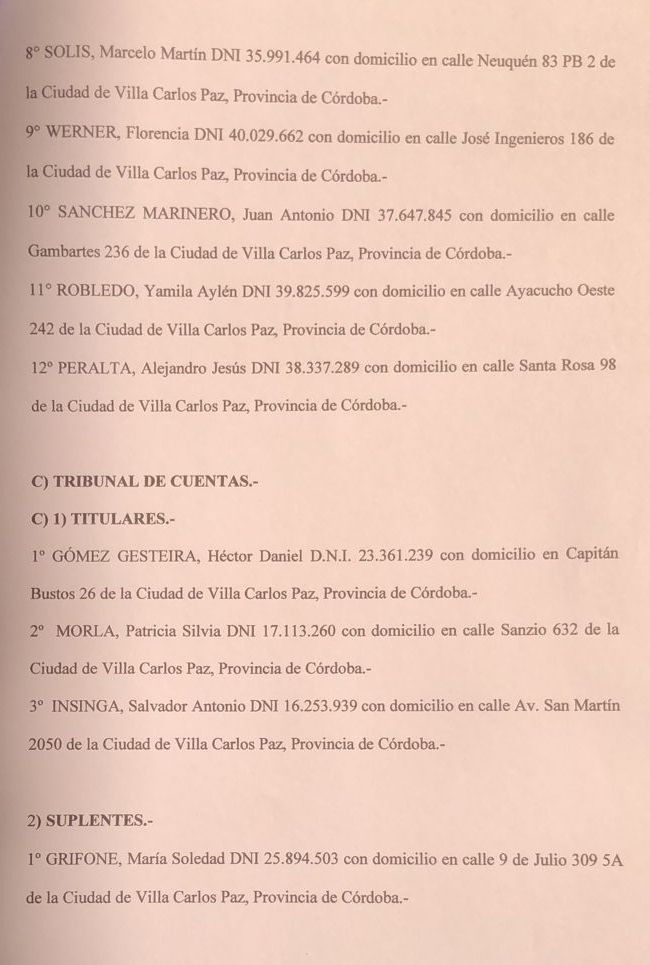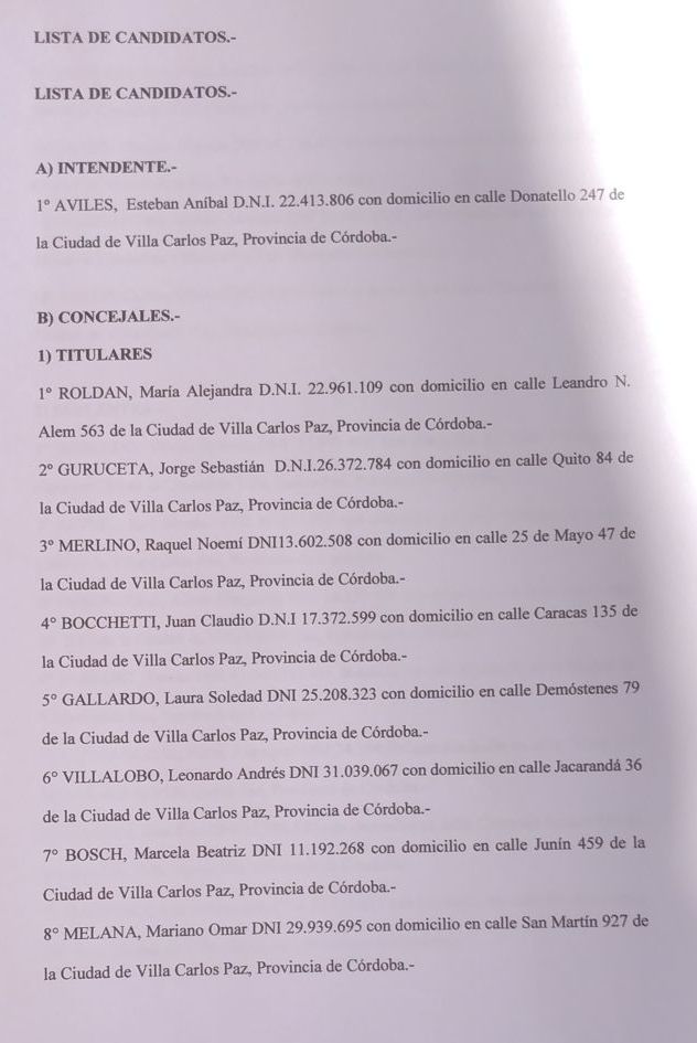 Se presentó hace instantes y último en hacerlo, la lista de candidatos de CARLOS PAZ UNIDO, ante la JUNTA ELECTORAL MUNICIPAL de Carlos Paz.