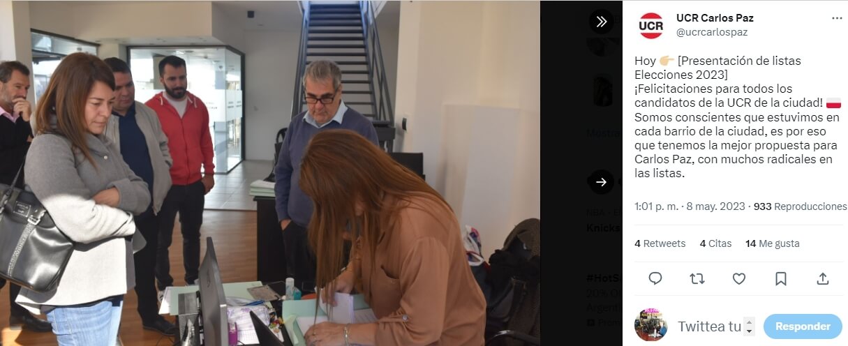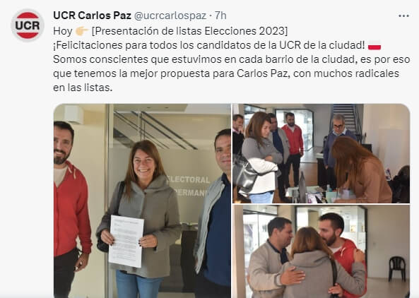 La Lista que presentan es la de Carlos Paz Unido, el Avilecismo, pero segun los twitts de la UCR Carlos Paz, pueden interpretarse que la UCR presenta Lista Propia, pero es una interpretacion. Lo Cierto es que aca se ve el explicito apoyo a la Lista de Aviles, Utilizando a la UCR Local, que entendemos NO todos estan de acuerdo con esa postura.