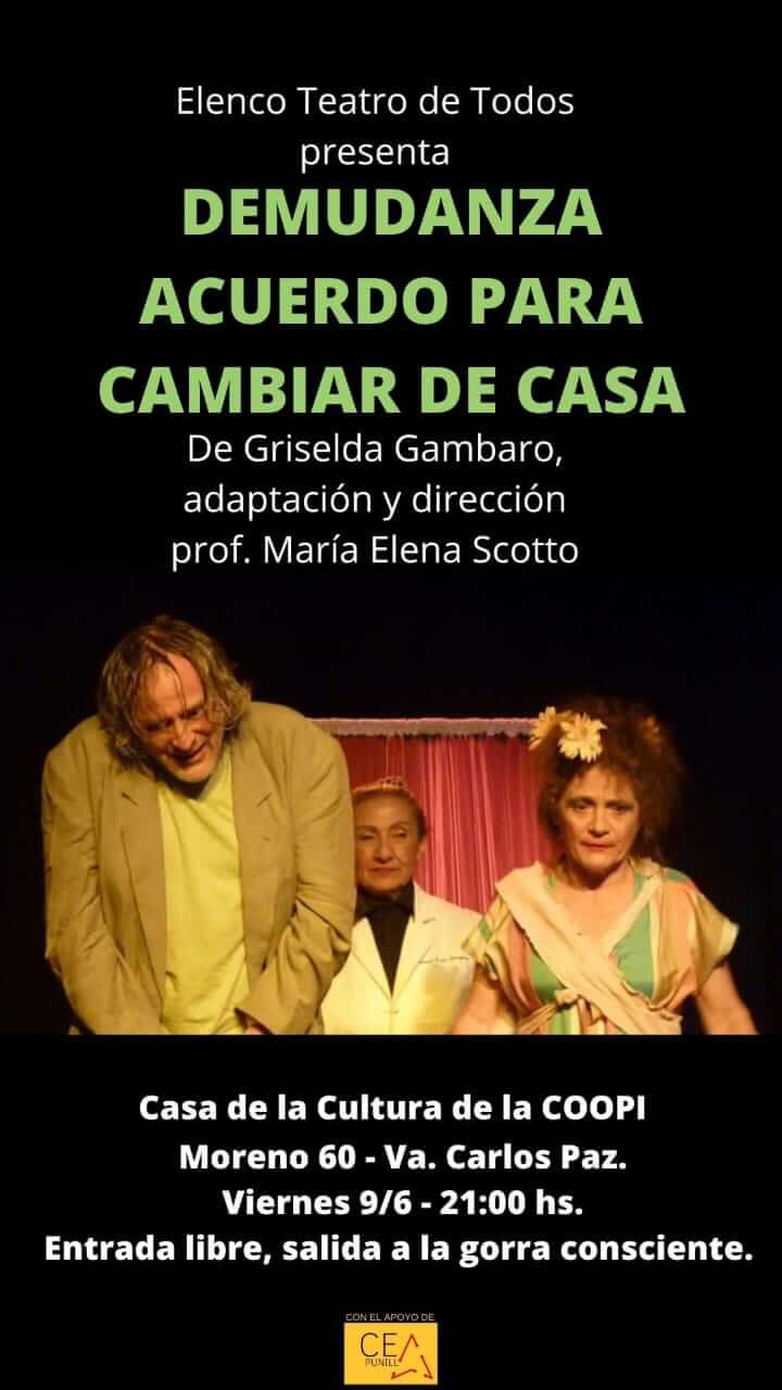 🔅 El elenco “Teatro de Todos” vuelve a la Casa de la Cultura de la COOPI para presentar “De mudanza: acuerdo para cambiar de casa”, una obra de Griselda Gambaro con adaptación y dirección de María Elena Scotto.