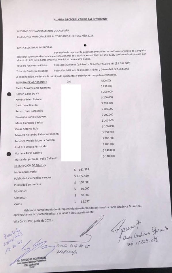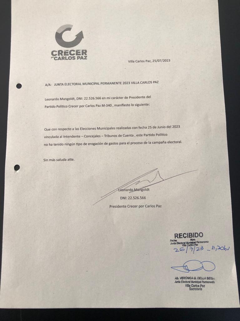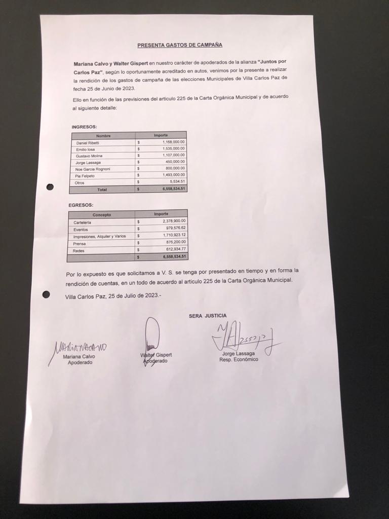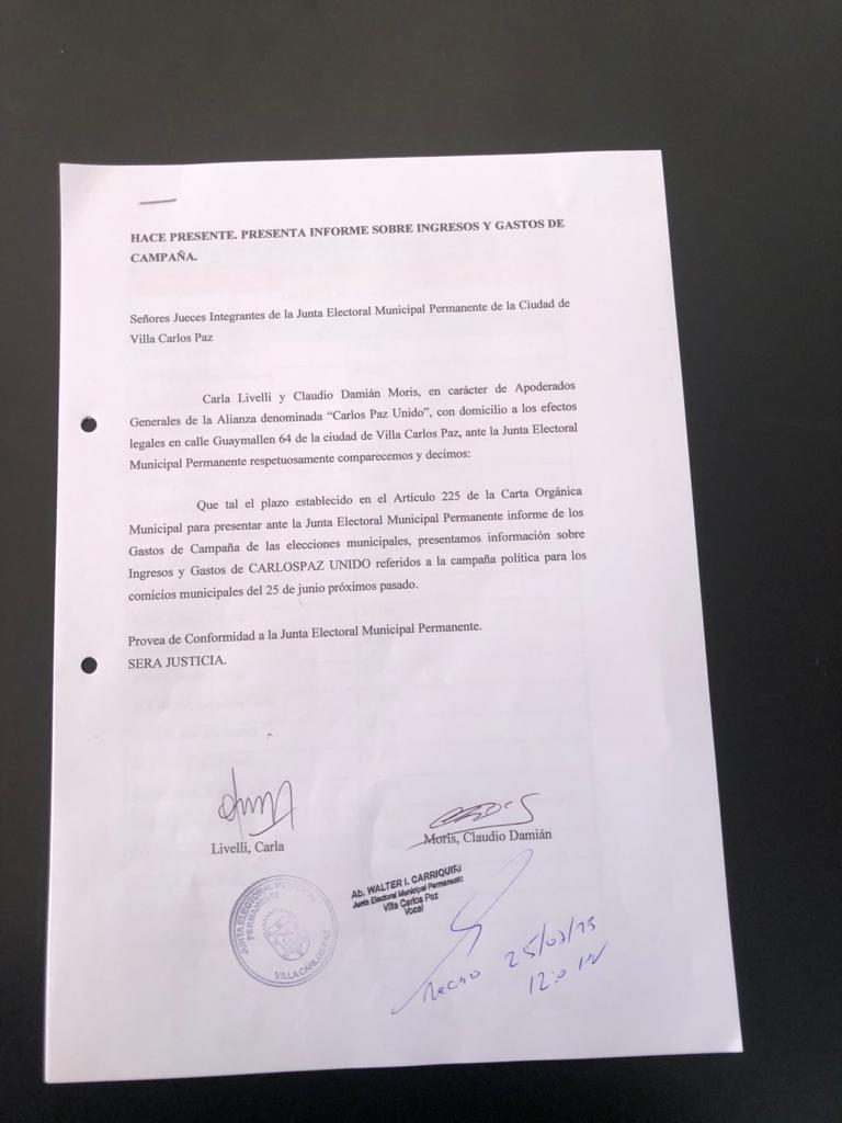 Los partidos políticos, que participaron de las últimas elecciones en Carlos Paz, presentaron los gastos de campaña electoral, conforme a los establecido por el artículo 225 de la COM, ante la Junta Electoral Permanente de la ciudad.