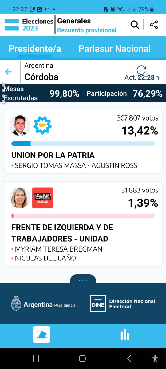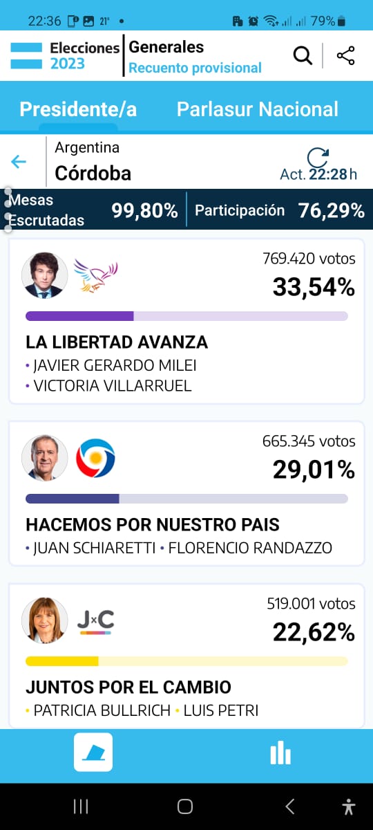 En la provincia de Córdoba el candidato a presidente más votado fue Javier Milei seguido del Gobernador Juan Schiaretti.