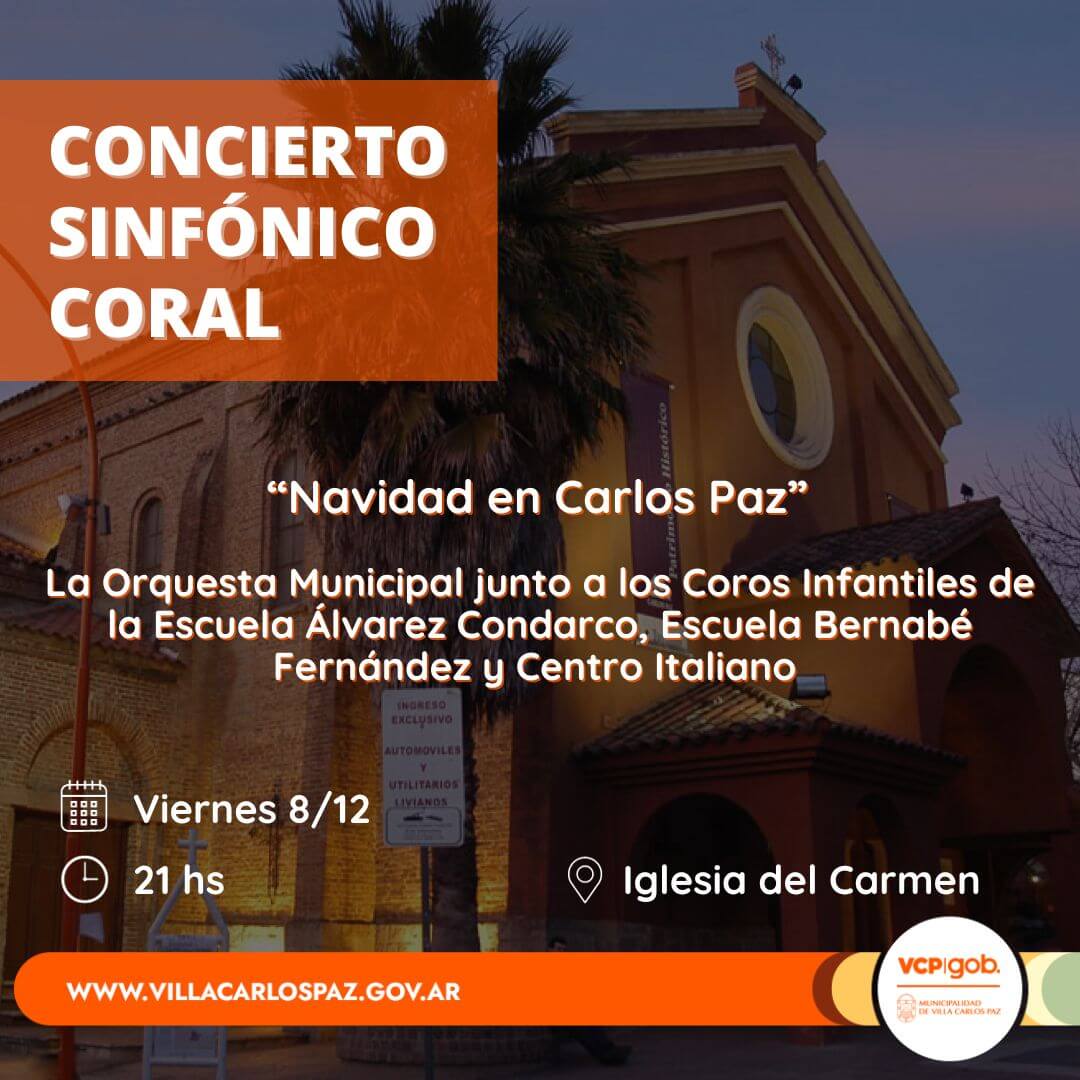 Con la organización de la Dirección de Cultura Municipal, la Orquesta Sinfónica de la Municipalidad de Carlos Paz realizará el próximo viernes 8 de diciembre a las 21 hs. en la Parroquia Nuestra Señora del Carmen (Av. General Paz entre San Ignacio y Caseros), un concierto sinfónico coral en vivo, denominado “Navidad en Carlos Paz”.