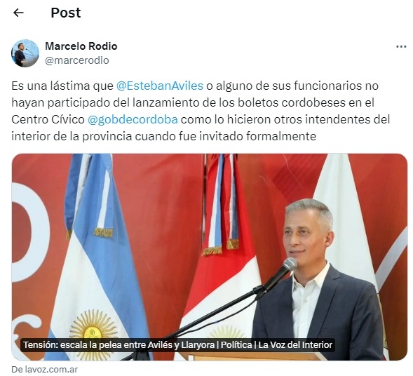 “Es una lástima que Avilés o alguno de sus funcionarios no hayan participado del lanzamiento de los boletos cordobeses en el Centro Cívico como lo hicieron otros intendentes del interior de la provincia cuando fue invitado formalmente”.