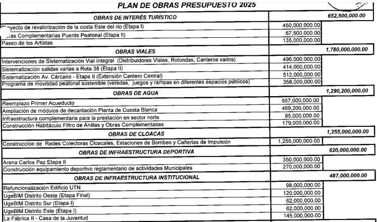 El plan de obras públicas 2025 para la ciudad de Villa Carlos Paz tiene una inversión presupuestada por $ 6.637.700.000.- (en dólares, a la cotización oficial U$S 6.562.234.-)