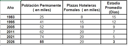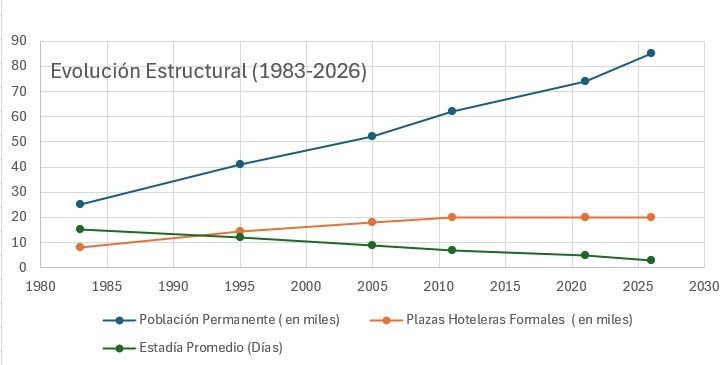 c) Evolución Estructural (1983-2026) – Año Población Permanente (en miles) Plazas Hoteleras Formales (en miles) Estadía Promedio (Días).