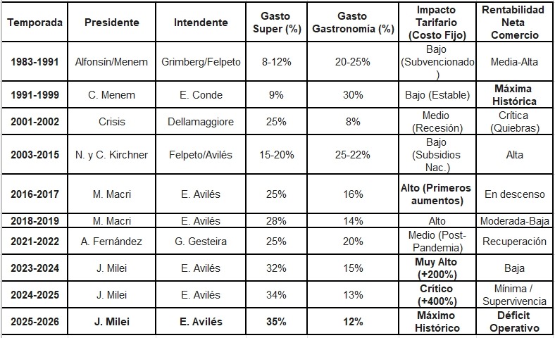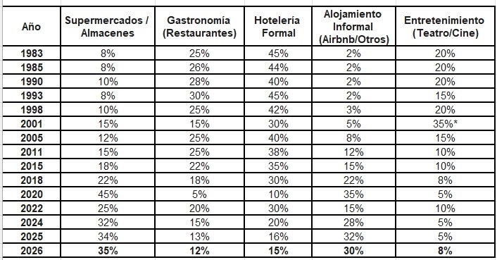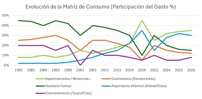 El Fin del “Derrame” Gastronómico: Desde 1993 (pico del 30%) hasta 2026 (12%), la gastronomía perdió más de la mitad de su relevancia en el presupuesto del turista. Esto impacta directamente en la recaudación por Tasa de Comercio e Industria, ya que el restaurante tributa más por valor agregado que el supermercado.