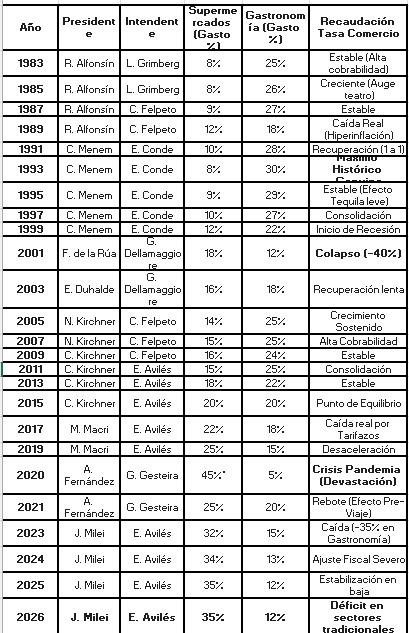Correlación Política: Las gestiones de Conde y la primera de Avilés gozaron de una recaudación saludable por el equilibrio entre supermercados y restaurantes. La gestión actual de Avilés en 2026 enfrenta el desafío de gravar la economía digital para compensar la caída del comercio tradicional.