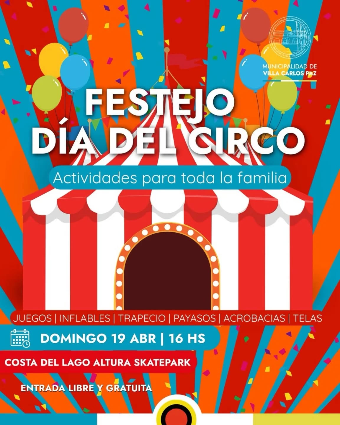 Con la organización de la Dirección de Cultura del Gobierno de la Ciudad, este domingo 19 de abril desde las 16 hs., a la altura del Skatepark de la costa del lago, en la ciudad de Villa Carlos Paz, se llevará a cabo el festejo por el Día Mundial del Circo a cargo de la escuela municipal de circo.